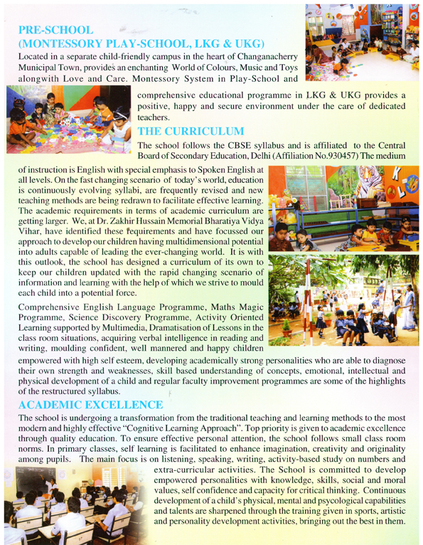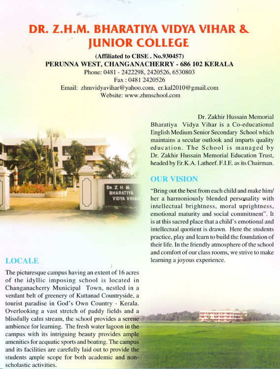 Education is the manifestation of the perfection that is already in man”. This fact is very much applicable in the case of Dr.Zakhir Hussain Memorial Bharatiya Vidya Vihar. In the new era of modernism it should be noted that the basic requirement lies mainly in establishing a systematic , rigorous and value based education method to empower the child to come up to the International standard.