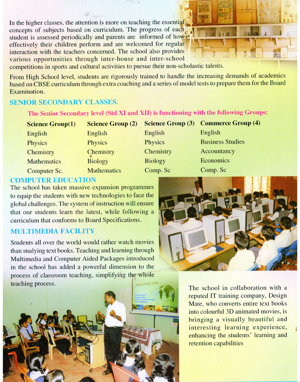 The school holds a banner “The Child is the most important person in this School. The Management, the Faculty and the Supporting staff all serve the cause of the Child.” Here, supreme importance is given to the versatile improvement of their talents and abilities. Special attention and care are given to find out their interests and attachments to arts items and they are groomed accordingly to meet the high standards. In the case of weakness in any field of study, they shall be hunted up and sufficient remedial coaching shall be given to compete with any other child, so as to enable them to be self confident.